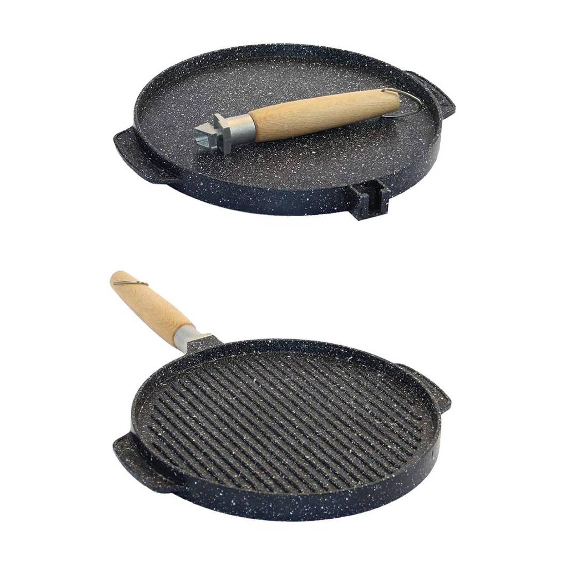 Con doppia superficie (liscia da un lato, rigata dall'altra) e manico smontabile in legno naturale. Realizzata in alluminio pressofuso ad elevato spessore, con rivestimento antiaderente di alta qualità. Esente da PFOA, lavabile in lavastoviglie. Prodotto 100% italiano.