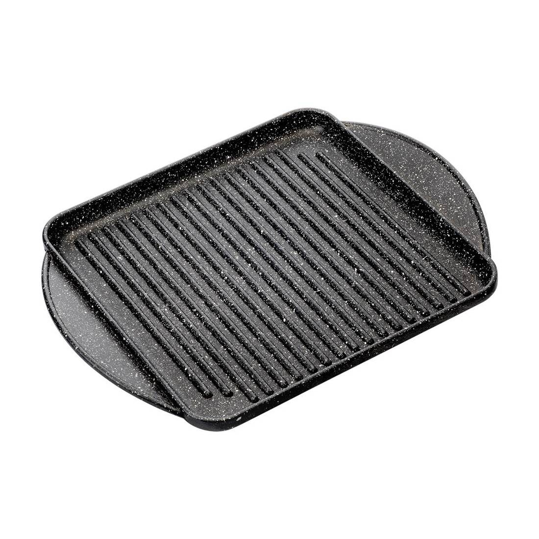 Con superficie rigata e manici integrati laterali. Realizzata in alluminio pressofuso ad elevato spessore, con rivestimento antiaderente di alta qualità. Esente da PFOA, lavabile in lavastoviglie. Prodotto 100% italiano.