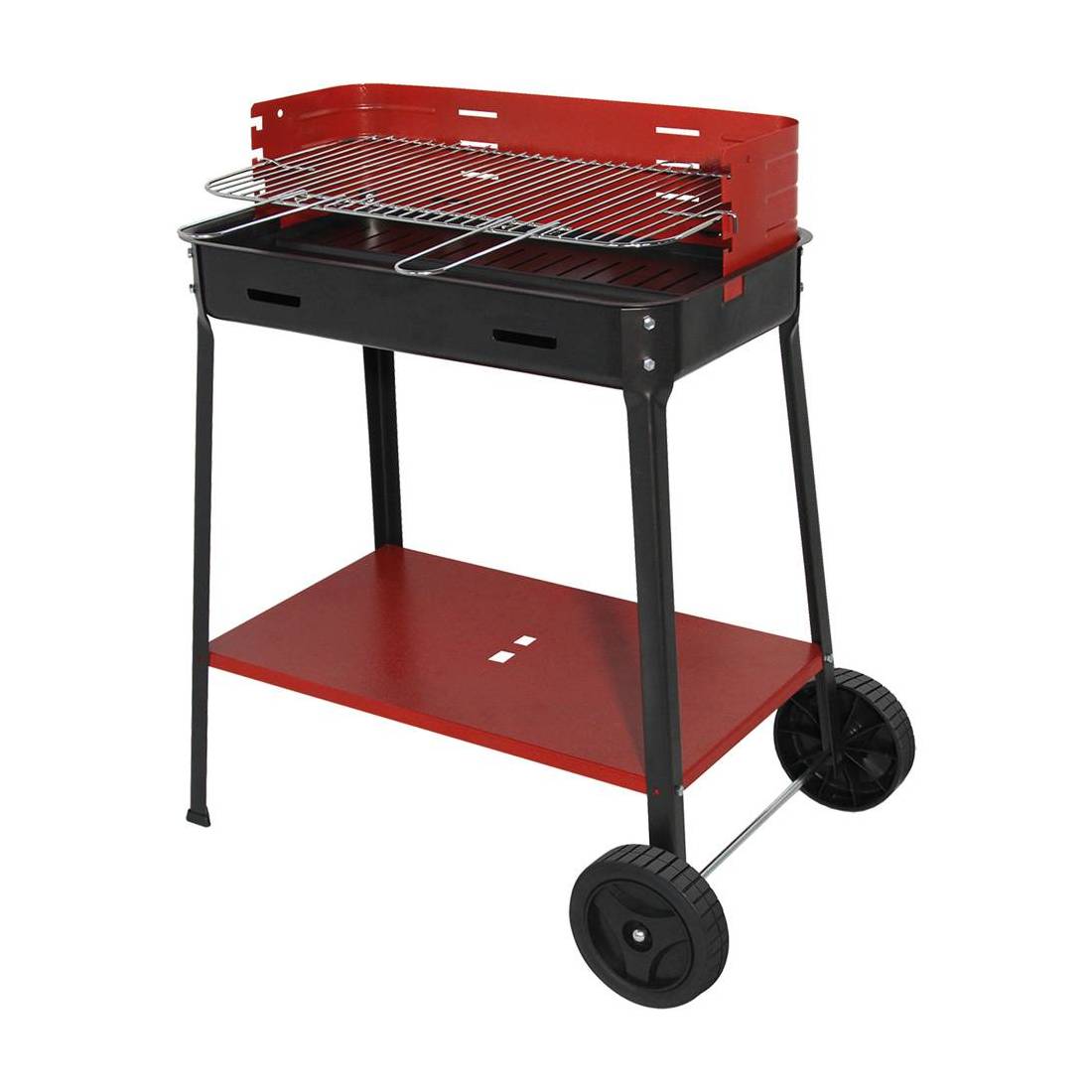 In ferro verniciato. Con ruote e ripiano laterale. Griglia acciaio con manici frontali.