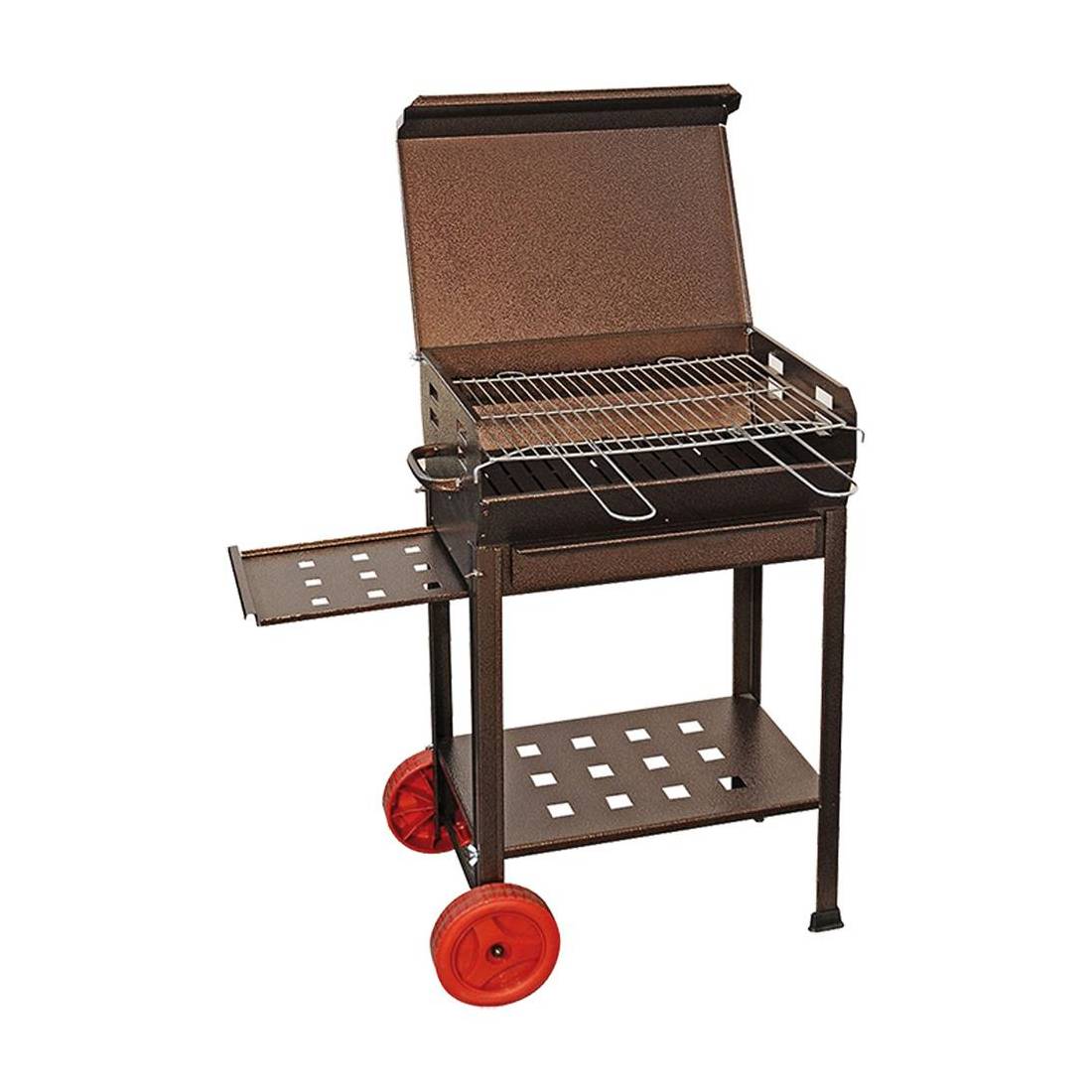 In ferro verniciato. Con ruote e ripiani laterali. Griglia acciaio con manici frontali.