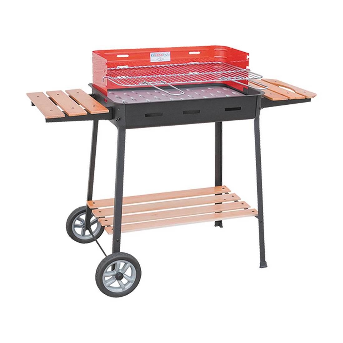 Con ruote gommate. Struttura in acciaio verniciato, supporto paravento con innesto di sicurezza in acciaio verniciato. Griglia di cottura in acciaio cromato regolabile in tre posizioni. Ripiani laterali e mensola inferiore in legno.