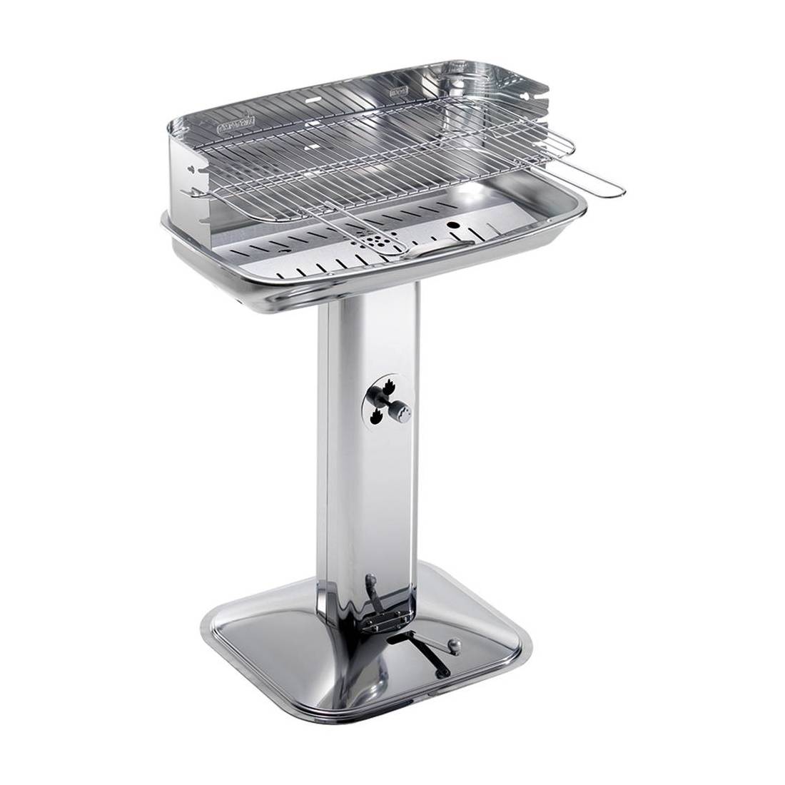 In acciaio inox con colonna dotata di presa d'aria regolabile e dispositivo d'accensione compreso. Raccogli cenere con dispositivo di scarico. Griglia di cottura in acciaio cromato regolabile in 4 posizioni, certificata per alimenti. Paravento in acciaio inox con innesto di sicurezza e bordo antigraffio. Braciere in acciaio.
