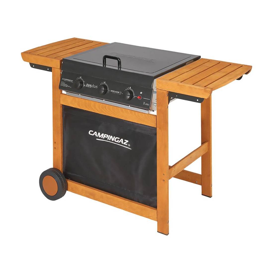 Superficie di cottura in ghisa e piastra da 60x46 cm, 3 bruciatori in ghisa, alimentazione metano/GPL. Coperchio in acciaio e carrello in legno di faggio. Consumo gas 830 g/h, altezza cottura 83 cm, accensione piezo. Con supporto bombola, 2 ruote. Dimensioni: cm. 128x59,1x88,4.