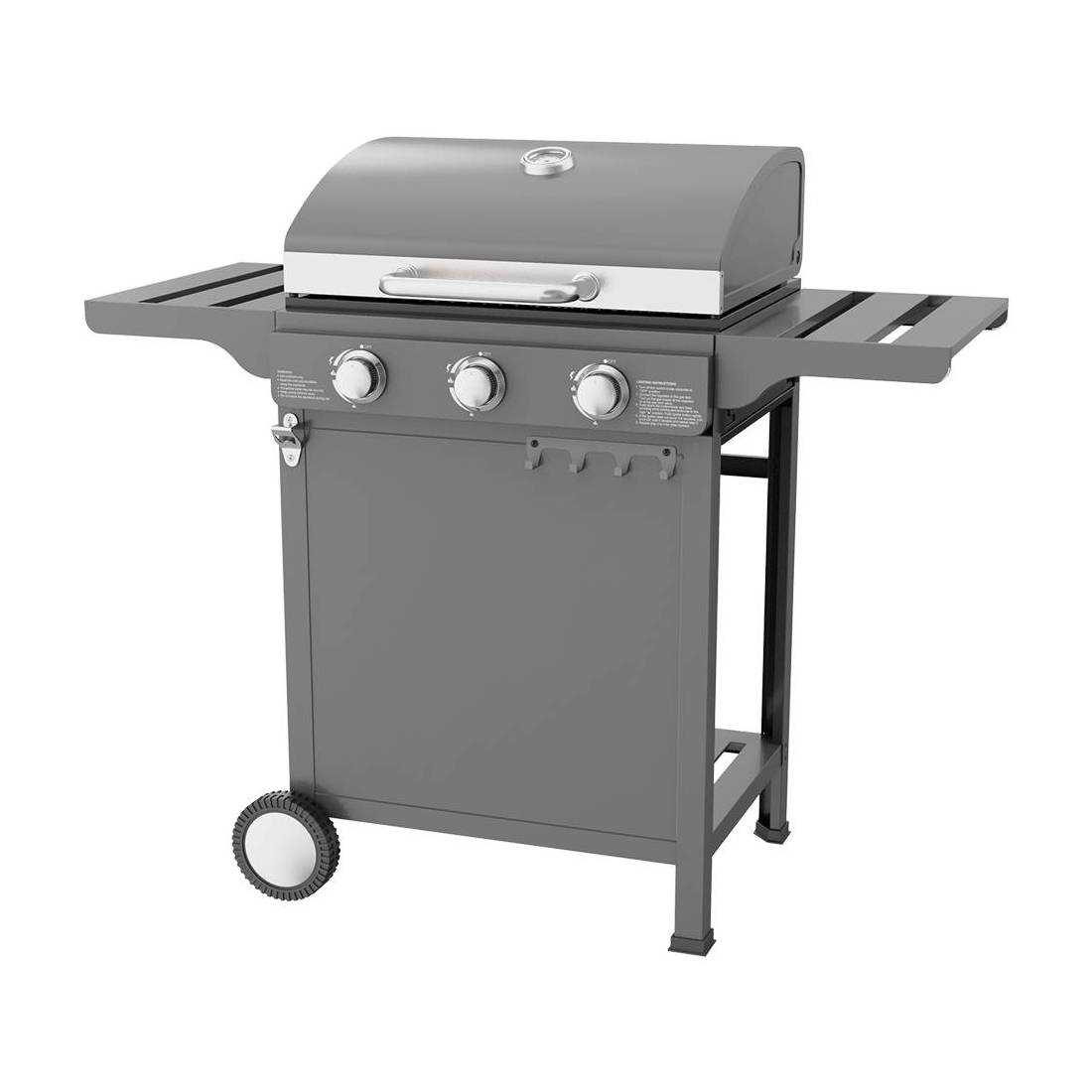 Struttura portatile a carrello, presenta un coperchio completo di termometro, mensole laterali e appendino per accessori. Comprende tre bruciatori (3x3 Kw) in acciaio inox a una rampa e tegolino frangifiamma. Piano di cottura misura 60x42 cm, e' inoltre dotato di una griglia di cottura (misura 42 x 35 cm) e una piastra di cottura (misura 42x22,5 cm) entrambe in ghisa smaltata. Accensione piezoelettrica. Dimensioni totali cm 104,5x118,50x57,5. Peso 27 kg. Particolarmente consigliato sia per grigliate outdoor che per uso professionale (nei settori della ristorazione, catering ed eventi).