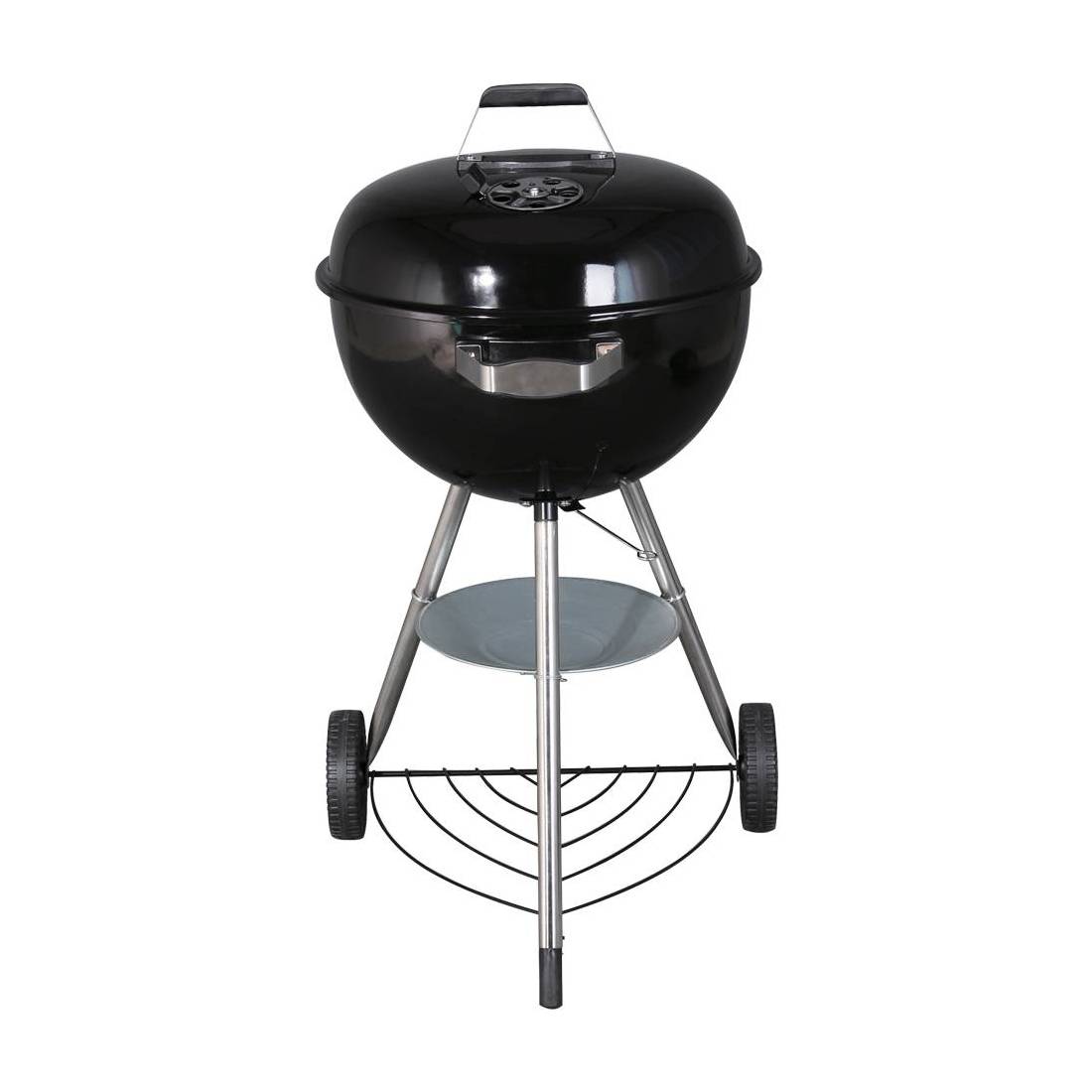 Dotato di ruote (M8 x 14,5 cm), con struttura in acciaio 45,8x h. 24,5 cm rivestita in smalto porcellanato nero, altezza di cottura 76 cm. Griglia alimenti cromata Ø43,2 cm e griglia carbone Ø 35 cm con smalto nero. Portacenere in acciaio zincato Ø 32 cm. Coperchio Ø 46,8 x h. 11,5 cm con presa d’aria Ø 9,5 cm e base a cremagliera 51x41 cm verniciata nera.