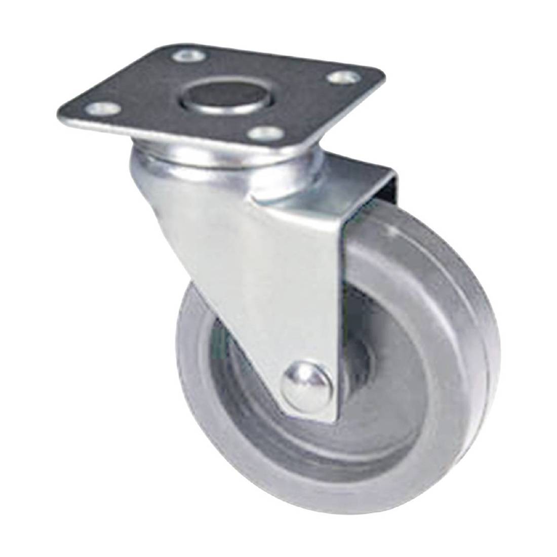 In gomma, con supporto in acciaio stampato zinco-cromato. Supporto rotante a piastra.