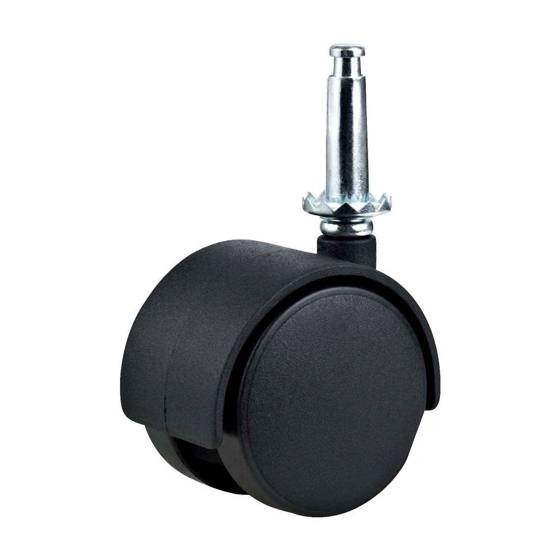 Dotata di freno. Realizzata con supporto e cuffia in nylon. Ruota doppia con perno filettato girevole. Impiego consigliato per mobili ufficio, mobili metallici, espositori. In blister.