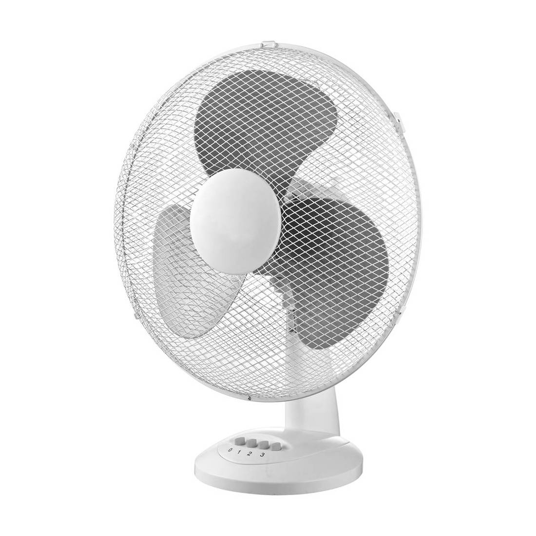 A 3 velocita'. 3 pale alimentate da un motore elettrico con una potenza di 45W. Il design compatto lo rende ideale per scrivanie o piccoli spazi. Oscillazione orizzontale, diametro 40 cm. Piantana tonda. Alimentazione 230V-50/60Hz. Colore bianco.