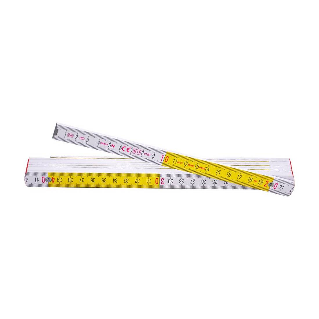 Doppiometro pieghevole con funzione di tracciamento. Legno di faggio selezionato di alta qualità da silvicoltura europearesistente alla rottura e per un'elasticità ottimale. Articolazioni in poliammide rinforzate con fibra di vetro. Verniciatura duratura e resistente agli agenti atmosferici. Cifre di grandi dimensioni e decimali in rosso per velocizzare la lettura. Soddisfa la direttive: MID, CE e marchio di controllo metrologico. Classe di precisione III. Larghezza 1,70 cm, Spessore della stecca 3,30 mm, lunghezza 2 mt. Colore: Bianco e giallo.