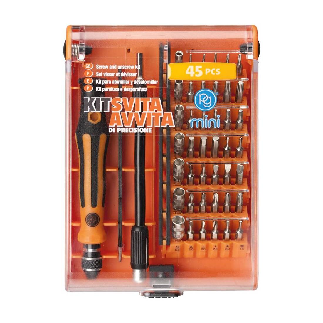 Composizione: 1 flessibile, 1 pinza di precisione, 1 cacciavite, 7 bussole M 2,5-M 3,0-M 3,5-M 4,0-M 4,5-M 5,0-M 5,5, 35 inserti di precisione: T3-4-5-6-7-8-9-10-15-20, H0,9-1,3-1,5-2,0-2,5-3,0-3,5-4,0, taglio 1-1,5-2-2,5-3-3,5-4, croce 1-1,5-2-2,5-3,5, triangolare 2, ad Y 2, ad U 2,6, pentalobo 0,8, circolare 0,8. In cassetta plastica.