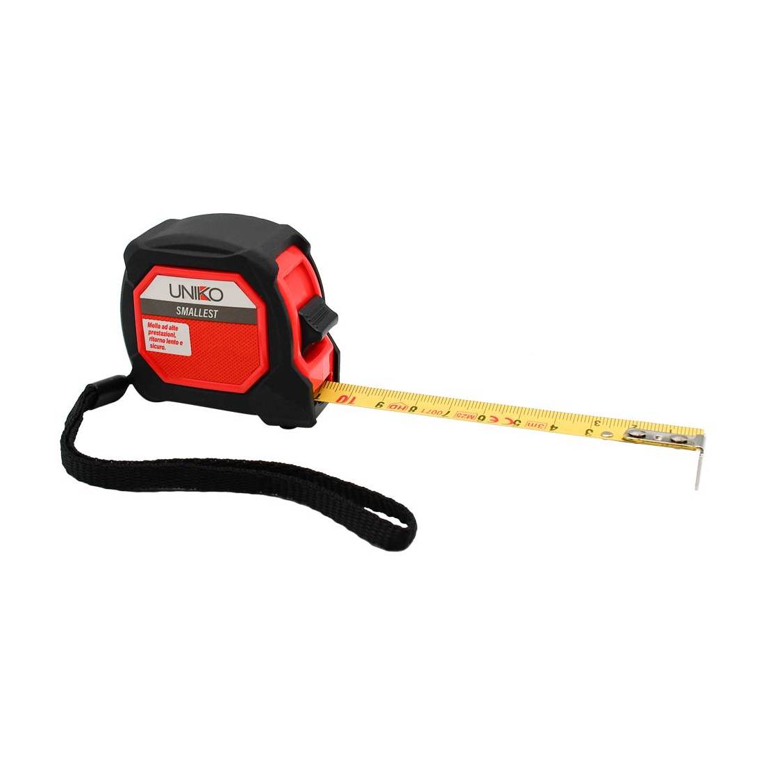 Metro a nastro in acciaio con struttura compatta in ABS, dotato di cinturino in tessuto e fermo per un utilizzo pratico e sicuro. Lama standard con finitura gialla opaca, spessore 0,105 mm. Dotata di gancio magnetico.