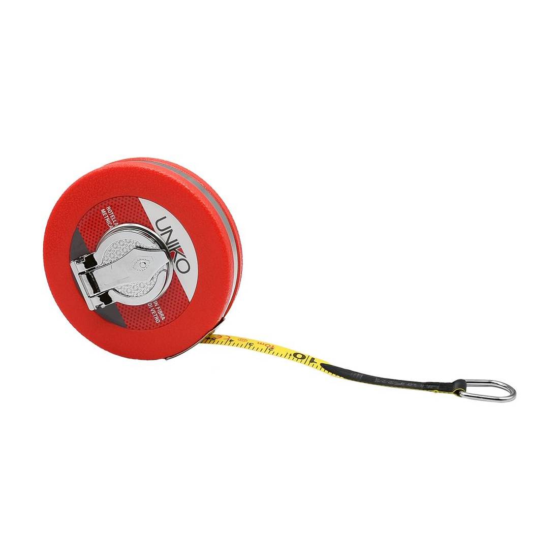 Metro a nastro con lama flessibile in fibra di vetro bianca con numerazione stampata su entrambi i lati. Dotato di gancio in metallo per un fissaggio sicuro. In custodia di plastica.