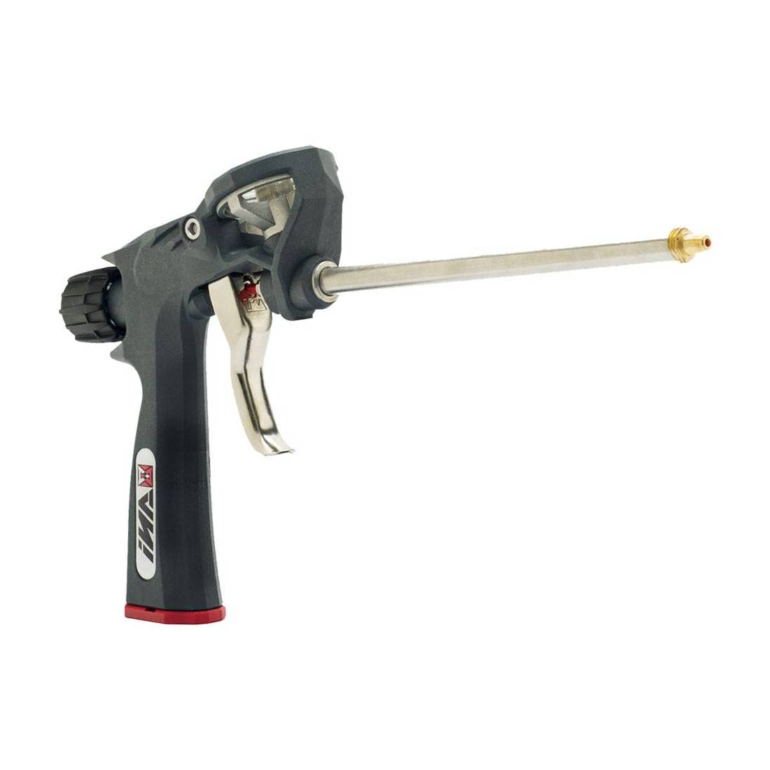Valvola interamente in metallo, guarnizioni tenuta in PTFE e premistoppa regolabile. Regolazione con pomello ergonomico a passo rapido. Sistema 'Wondertip' con accessorio per la pulizia del puntale e la valvola da residui di schiuma indurita. Indicata per la posa qualificata di serramenti, tegole, coppi, cappotti isolanti. Adatta per il riempimento di cavità di difficile accesso. Funzionamento ottimale sia con schiume a bassa ed alta espansione.