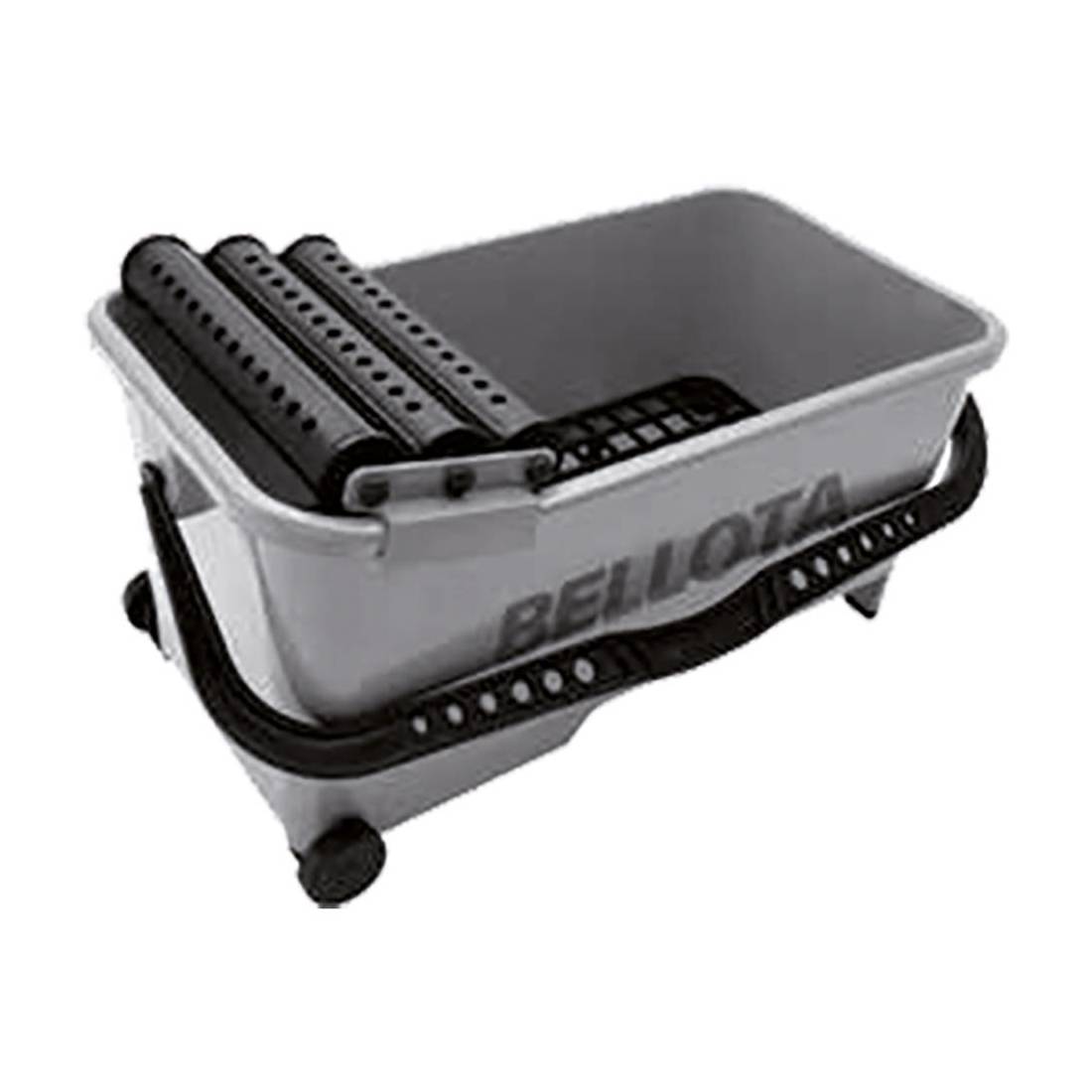 Vasca resistente in plastica antiurto. Completa di due ruote più due piedi. Tre rulli in plastica su boccole antiusura e griglia in plastica. Manico superiore.