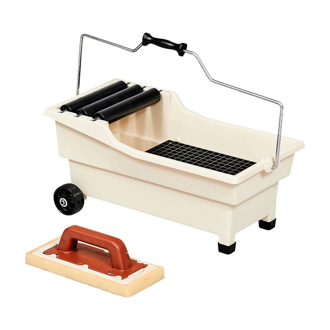 Vasca in plastica antiurto, su due ruote più due piedi. Tre rulli in plastica su perni in acciaio. Griglia e frattone in plastica.