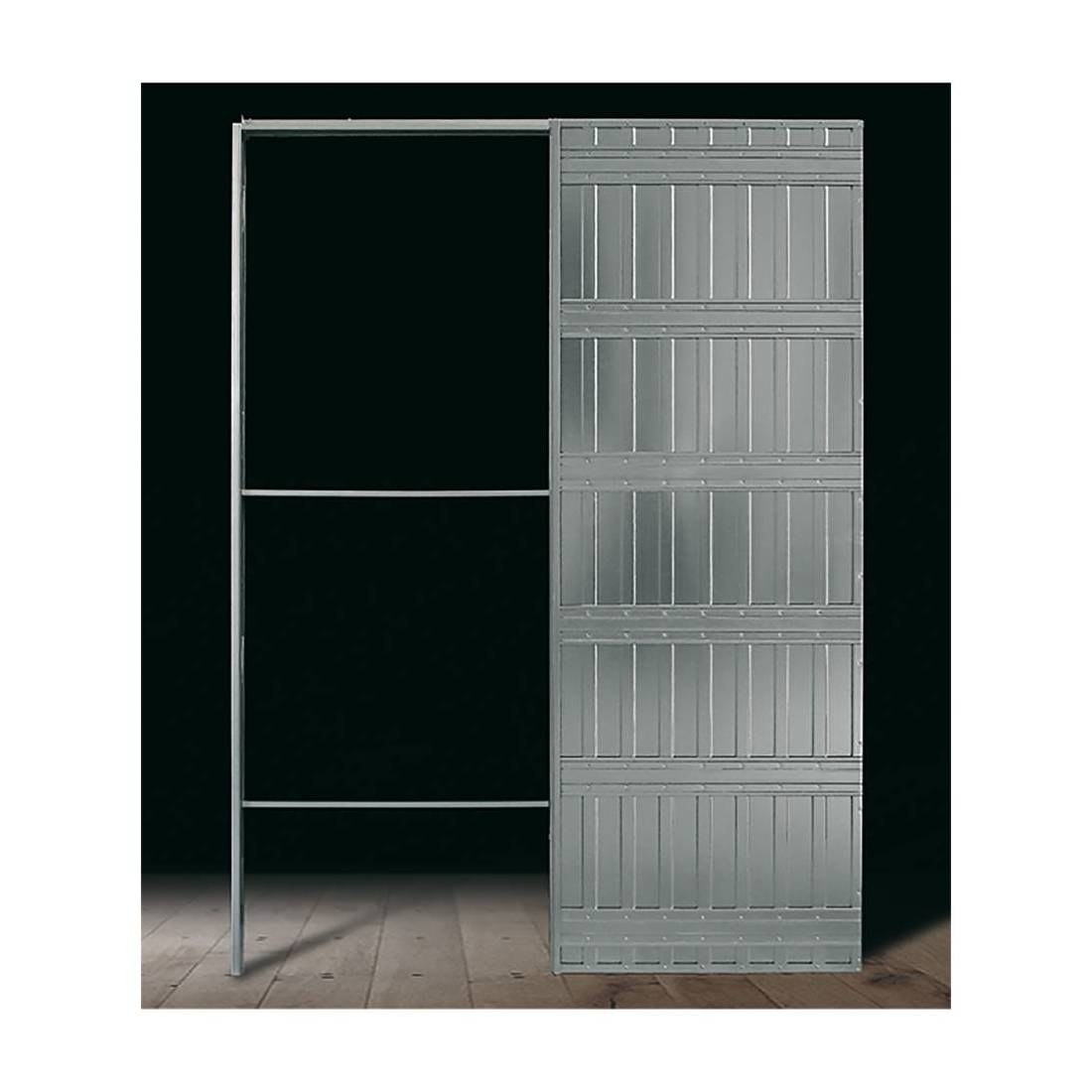 Pannelli struttura realizzati in lamiera zincata a spessore, caratterizzata da nervature di irrigidimento lungo da direzione verticale che lo rendono autoportante. Rete in acciaio zincato a maglia fitta, agganciata direttamente al pannello senza punti di saldatura. Guida scorrevole in profilo di alluminio estruso. Carrelli autoportanti con ruote in nylon e cuscinetti ad aghi cementati (portata standard di 80 kg), studiati per conferire perfetta scorrevolezza e maggiore silenziosità. Larghezza vano carrelli 6 cm. Prodotto Made in Italy.