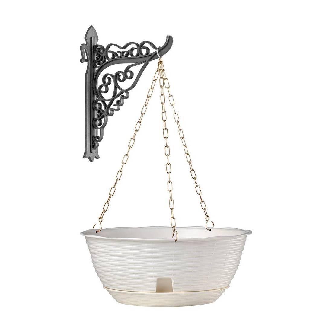 In plastica. Set per il fissaggio a muro. Composizione: staffa in plastica, catena dorata a 3 capi, sottovaso, busta con viti e tasselli.