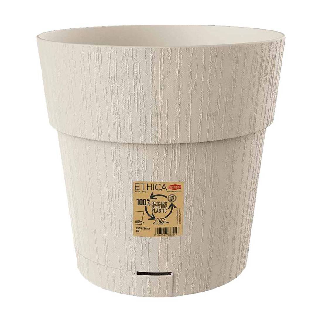 In plastica riciclata e riciclabile 100%. Stampaggio ad iniezione, infrangibile e leggero. Resistente al gelo (-20°) e raggi solari. Riserva acqua incorporata. Senza sottovaso. Prodotto Made in Italy.