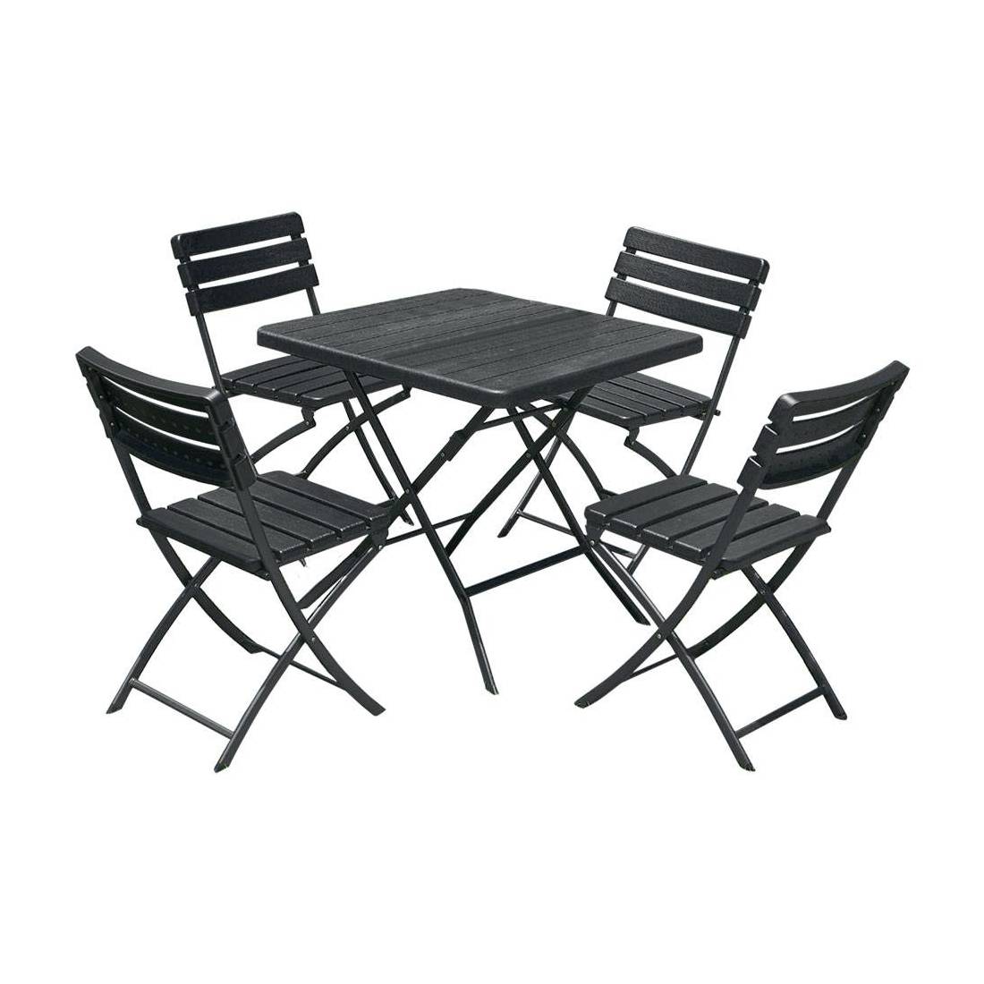 Composizione: 4 sedie pieghevoli senza braccioli da cm.58x46,5xh.81, 1 tavolino pieghevole quadro da cm. 78x78xh.74. Struttura portante in metallo verniciato e doghe in HDPE (polietilene alta densità).