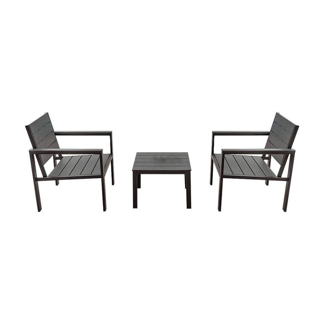 Composizione: 2 sedie con braccioli da cm. 62,5x64xh.78, 1 tavolino da cm. 52x48xh.39. Struttura portante in metallo verniciato e doghe in composito di resine termoplastiche ad effetto legno.