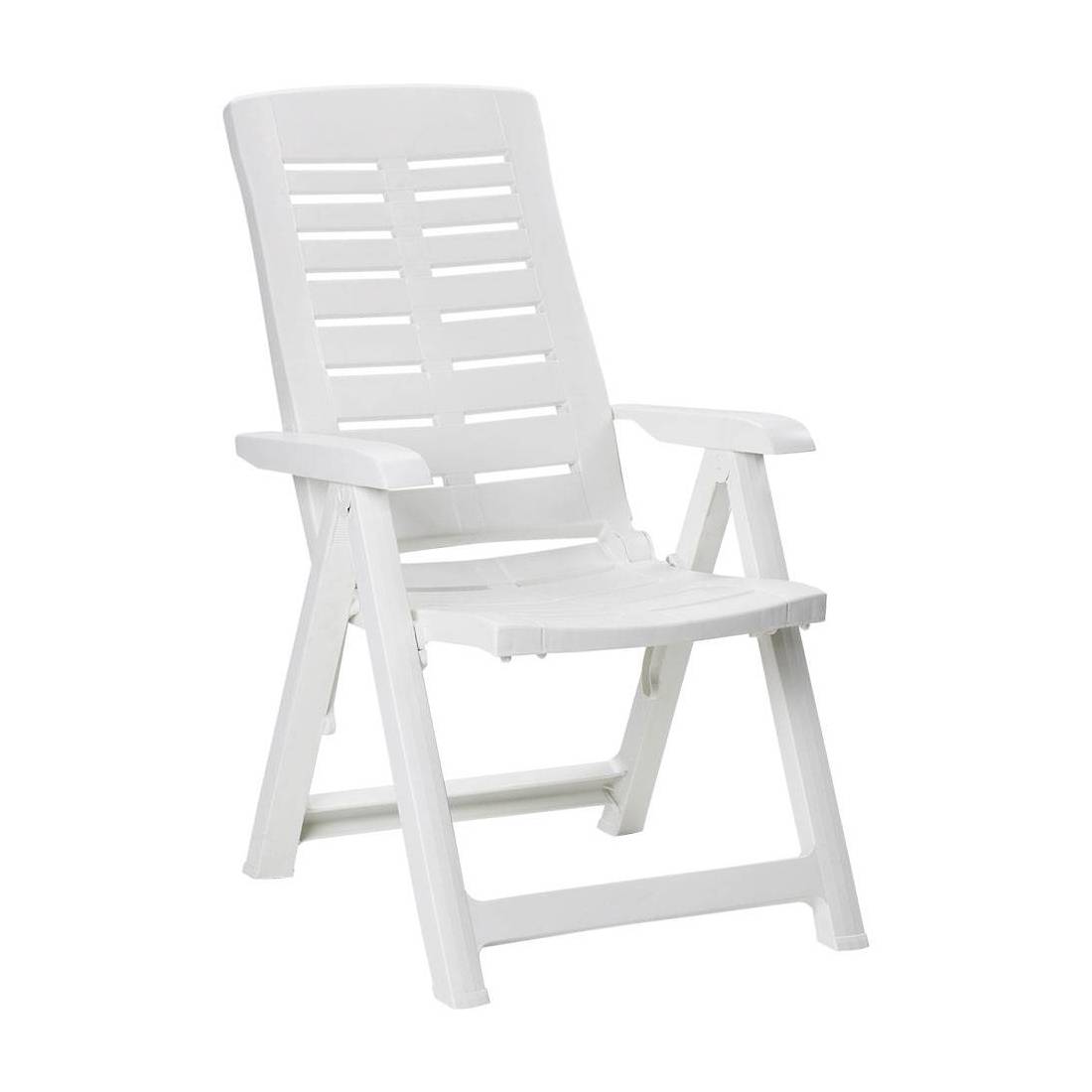 In polipropilene. Resistente agli agenti atmosferici. Dimensioni cm 60x61 H.109. Possibilità di adattare lo schienale in posizioni diverse. Con braccioli.