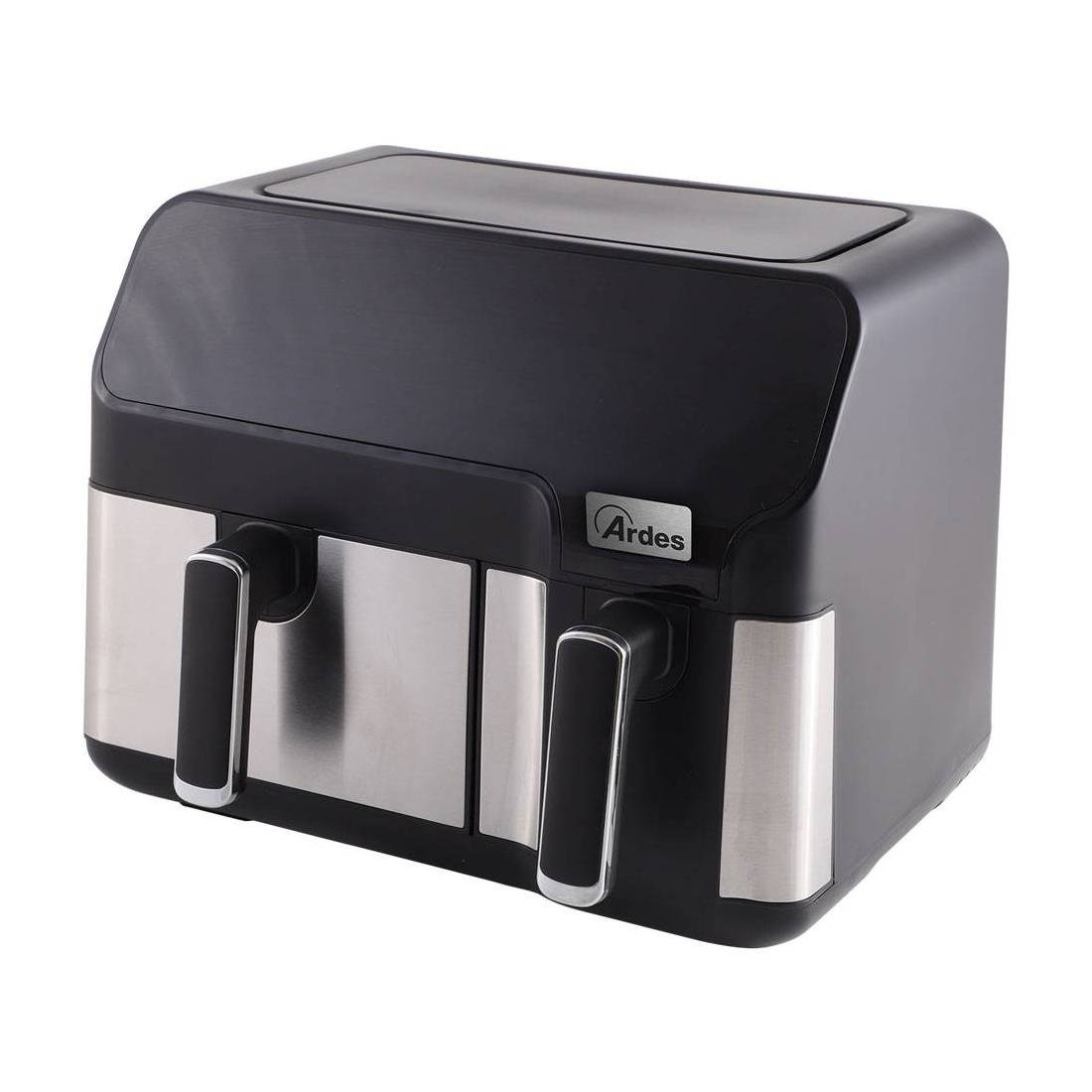 Dotata di doppio cestello da 5,5 + 3,5 litri. Frigge senza olio. Con 8 programmi preimpostati di frittura. Capace di generare un flusso di aria calda in grado di cuocere unformemente ed in maniera veloce. Pannello controllo touch. Cestelli da 19x22,5x12,5 cm + 12x22,5x12,5 cm. Timer 60 minuti, temperatura regolabile da 80 a 200°. Temperatura e timer indipendenti per ogni cestello. Voltaggio 220/240V. Frequenza 50/60 Hz. Dimensione cm 39x35xh.30,5.