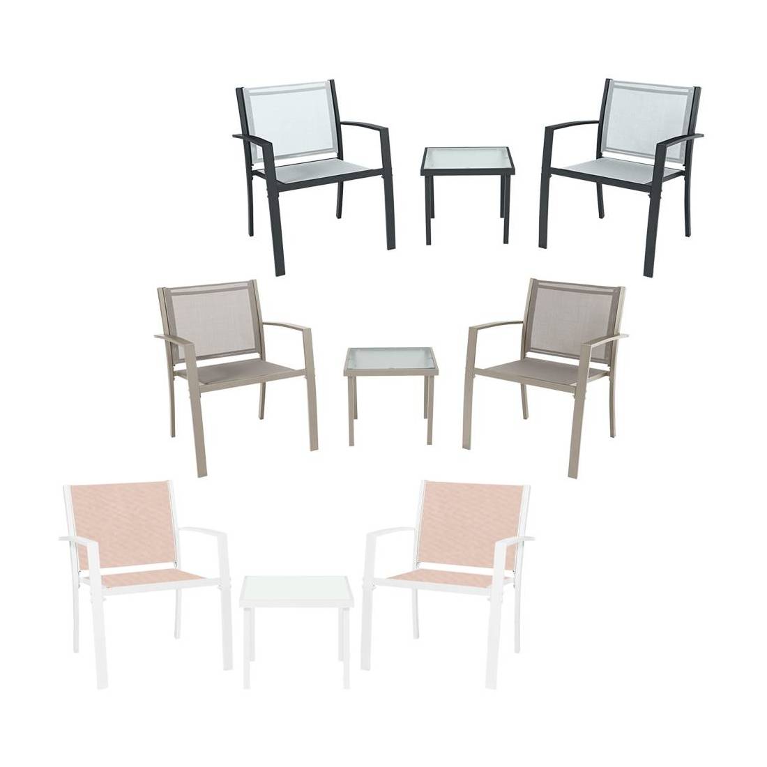 Composto da 2 poltrone (misura: 58 x 58 x h 75 cm) e 1 tavolino (misura:44 x 44 x h 38 cm) con piano in vetro temperato da 5 mm. Realizzati in acciaio verniciato con sedute in textilene resistente.