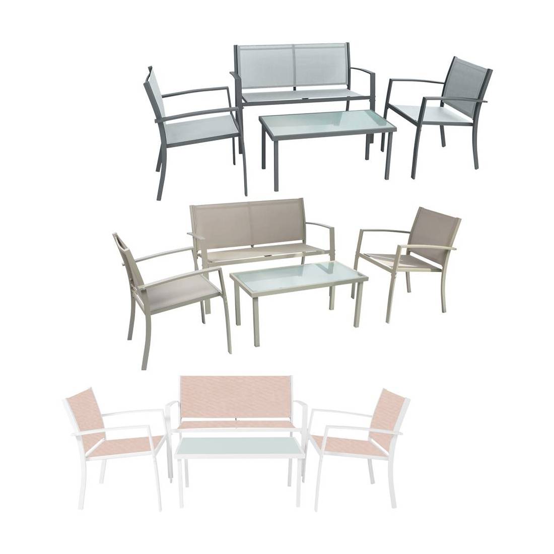 Composto da 1 divano (misura: 110 x 58 x h 75 cm), 2 poltrone (misura: 58 x 58 x h 75 cm) e 1 tavolino (misura:84 x 44 x h 38 cm) con piano in vetro temperato da 5 mm. Realizzati in acciaio verniciato con sedute in textilene resistente.