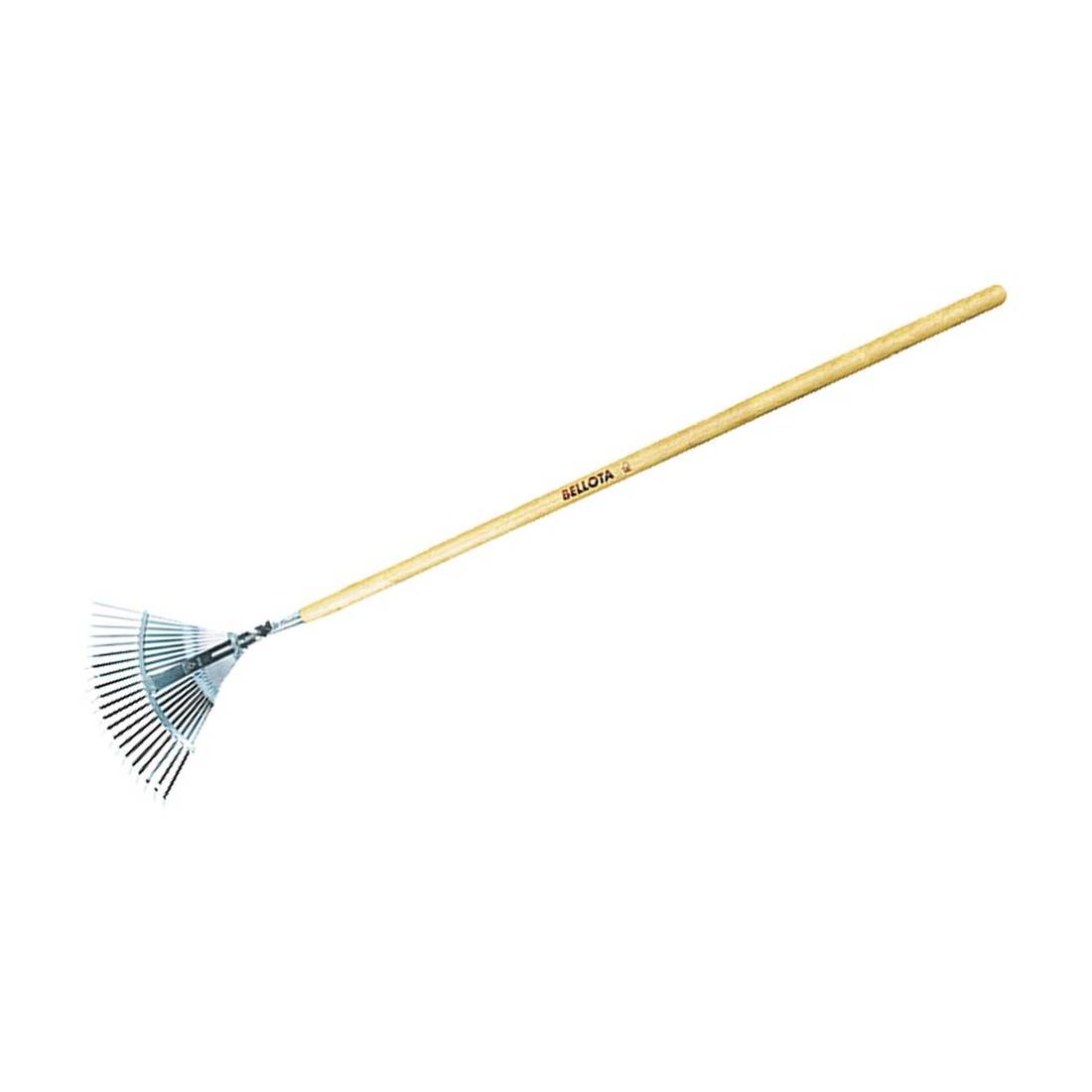 Con manico in legno. Denti piatti, larghezza regolabile da 385 mm a 480 mm. Ideale per la pulizia di resti di erba tagliata e foglie senza danneggiare il prato.