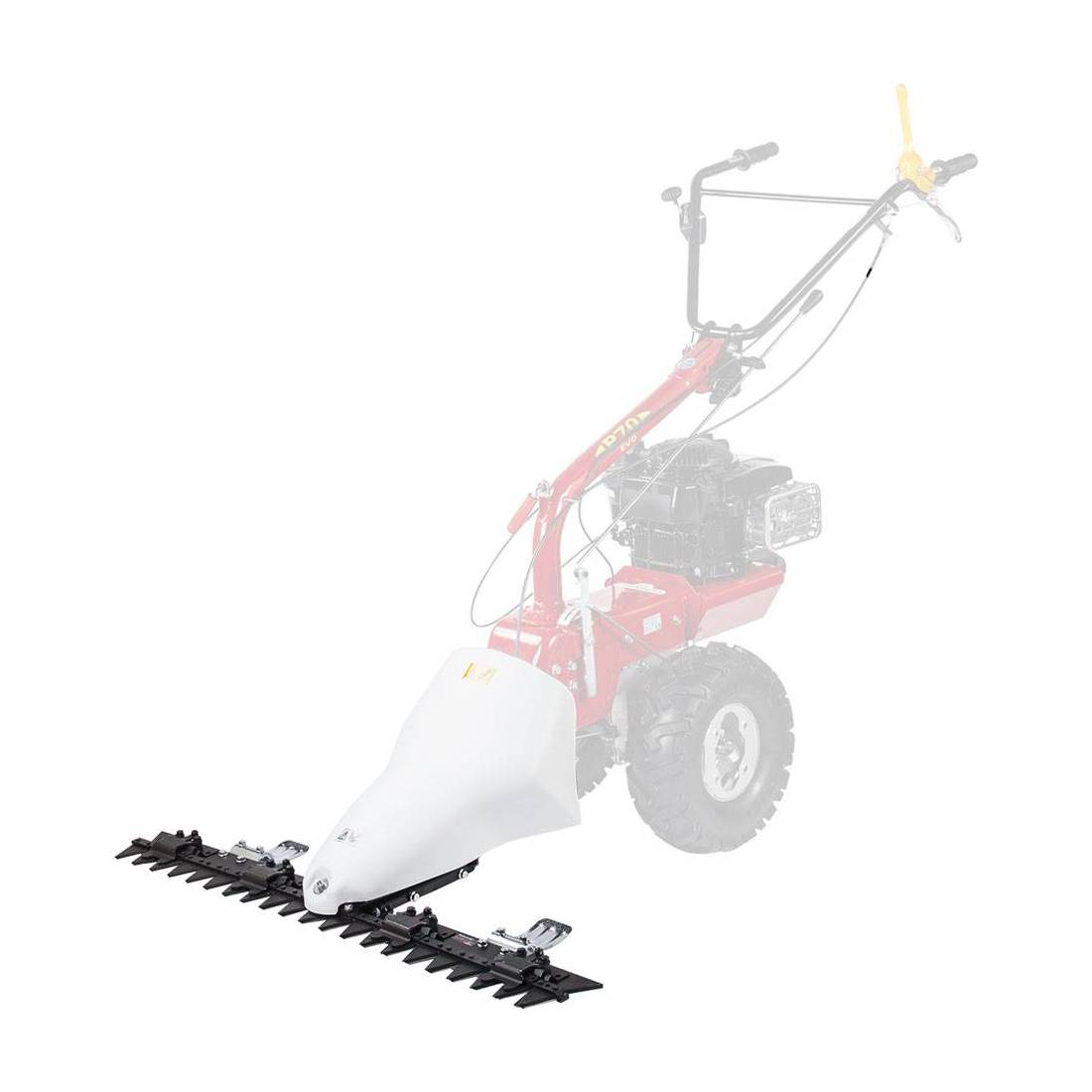 Larghezza lavoro cm 107. Movimento di lavoro a doppia lama con attacco centrale. Altezza di taglio regolabile 2 > 5 cm.