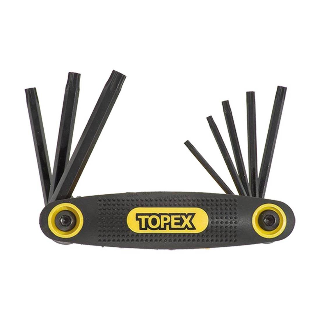 In acciaio al cromo vanadio. Impugnatura ergonomica. Misure T9, 10, 15, 20, 25, 27, 30, 40. Con supporto pieghevole.