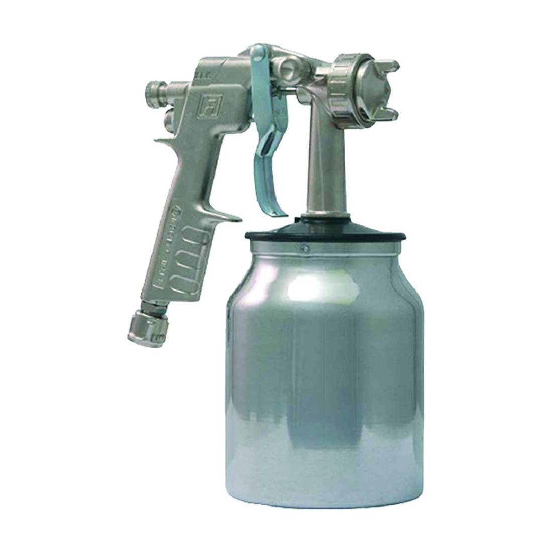 Aerografo per verniciatura con tazza inferiore in alluminio da 1000cc con chiusura a baoinetta. Coperchio in Nylon6. Tubo di pescaggio in nylon 10x8. Attacco alimentazione aria aereografo 11/A. Confezionato in scatola.