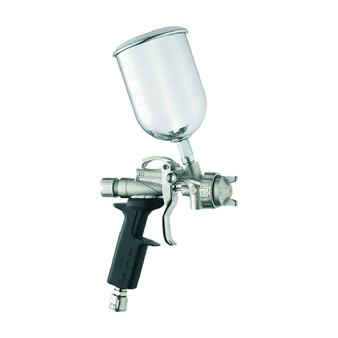 Aerografo per verniciatura con tazza superiore in alluminio con chiusura a pressione e dispositivo salvagoccia. Attacco alimentazione aria aereografo 11/A. Confezionato in scatola.