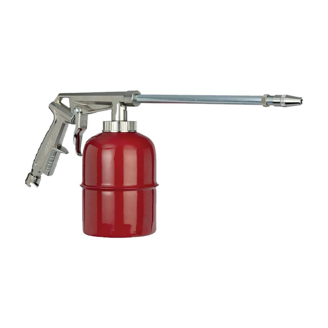 Pistola di lavaggio professionale con serbatoio in acciaio da lt.1, ugello regolazione getto. regolatore portata aria e valvola aria ad apertura progressiva. Campo di impiego: Aria compressa/ Nafta.