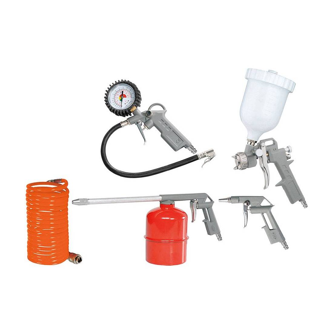 Composto da: aerografo con serbatoio superiore in plastica da 500 cc, pistola gonfiaggio, tubo spirale con raccordi 5 mt., pistola soffiaggio aria e pistola lavaggio con serbatoio in metallo da 400 cc. In scatola.