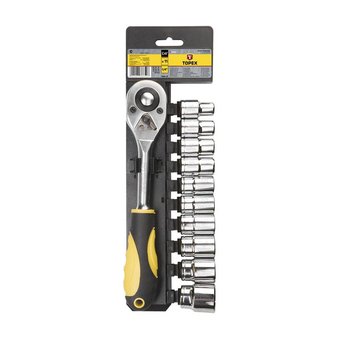 Con supporto in plastica. Bussole: mm 10 - 12 - 13 - 14 - 15 - 16 - 17 - 19 - 21 - 24 e chiave a cricchetto da 1/2'.
