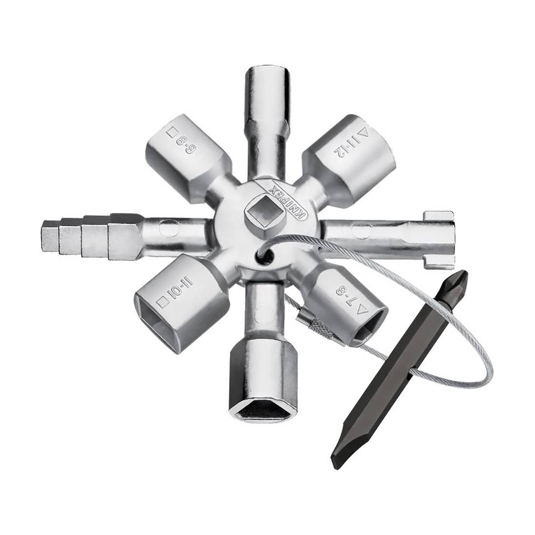 Realizzata in pressofusione di zinco. Indicata per armadi elettrici, sistemi di chiusura cassette gas, acqua, elettricità, impianti di climatizzazione e ventilazione, valvole di arresto, quadri elettrici. A 8 bracci: 2 chiavi a croce unite tramite calamite per minimo ingombro. Con inserto per viti intaglio 1 x 7 mm e a croce PH2. Chiavi e inserto per viti uniti da robusto filo metallico in acciaio inox. Misure mm: a) 5/6 -7/8 -9/10 -11, b) 7/8 -9/10 -11 -12, c) 3 - 5, d) 6, e) 6 - 9. In blister.