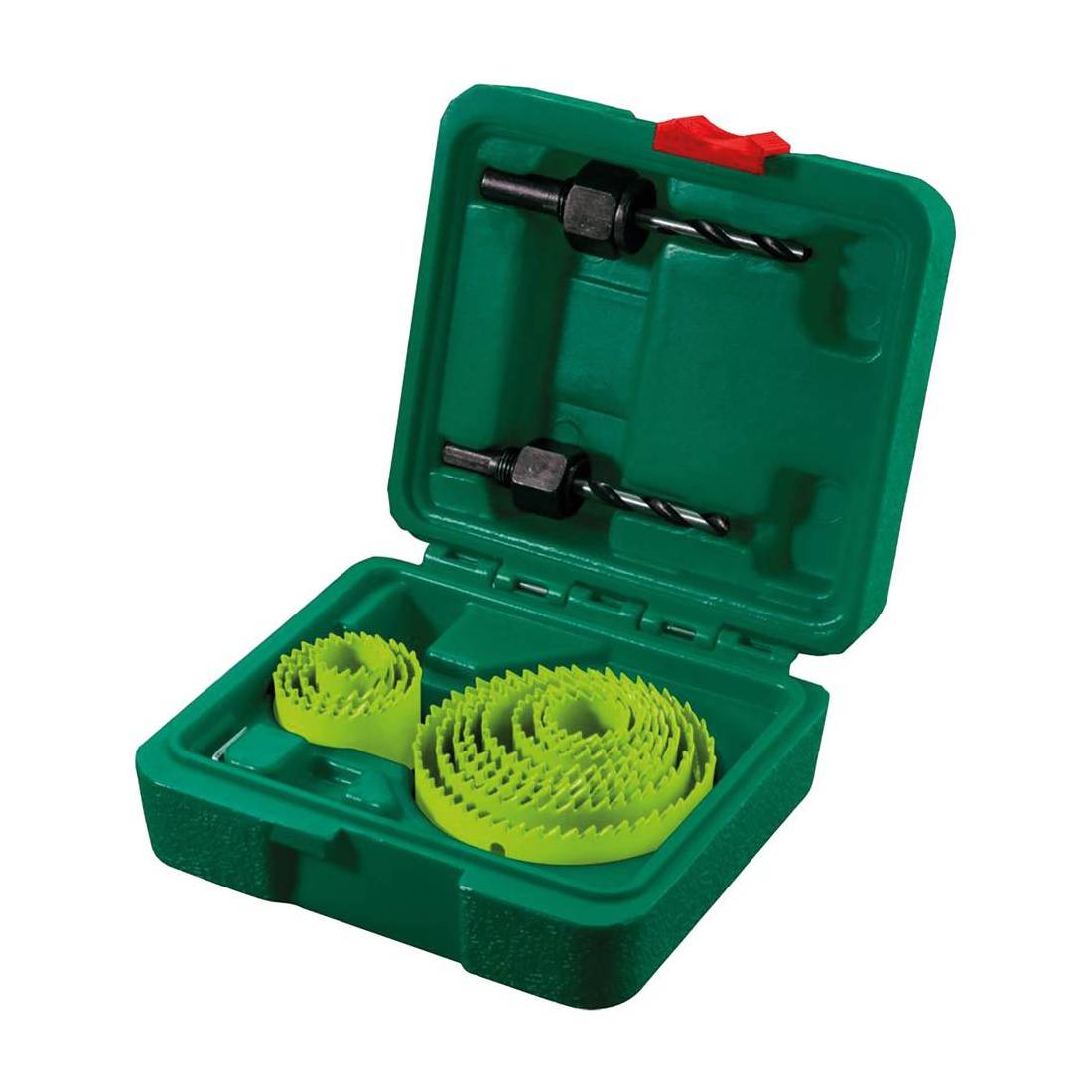 Realizzate in acciaio, consentono perforazione efficiente e fori precisi su acciaio, legno, plastica, materiali compositi. Composizione set: 19,22,25,29,32,35,38,44,51,57,64,76 mm. Due punte albero incluse. In valigetta plastica.
