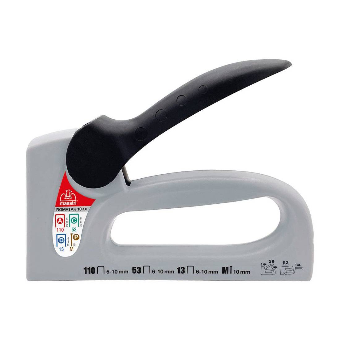 Adatta per tutti i lavori di decorazione, tappezzeria, falegnameria, vetrinistica e fissaggio. Corpo in nylon caricato al 30% fibre di vetro, maniglia in acciaio indurito ricoperta in resina poliuretanica. Leva di azionamento diretta, bloccaggio mediante incastro per arretramento maniglia. Frontale in acciaio indurito. Spingipunto non estraibile, caricamento inferiore con carrello estraibile e tasto di chiusura a molla. In blister.