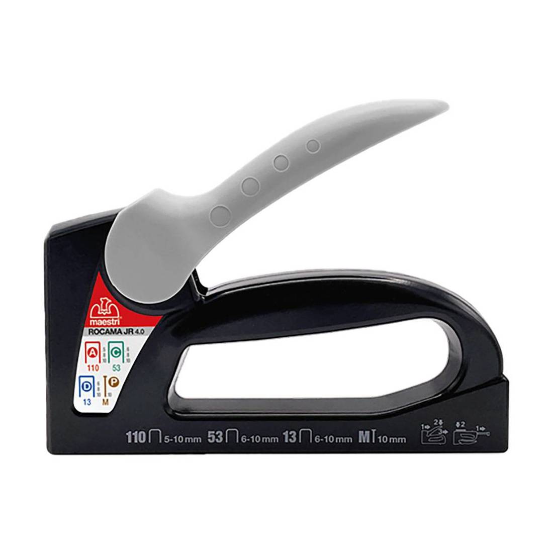 Con maniglia antiscivolo e blocco maniglia. Sistema 4 in 1 che consente di utilizzare quattro tipi di punti e chiodini senza necessità di regolazione. Adatta per assemblaggio telai e cornici in legno, tappezzeria, ricopertura di divani e mobili. Fissaggio di tutti i tipi di carta e stoffa. Massima capacità di infissione con il minimo sforzo. Caricamento inferiore.