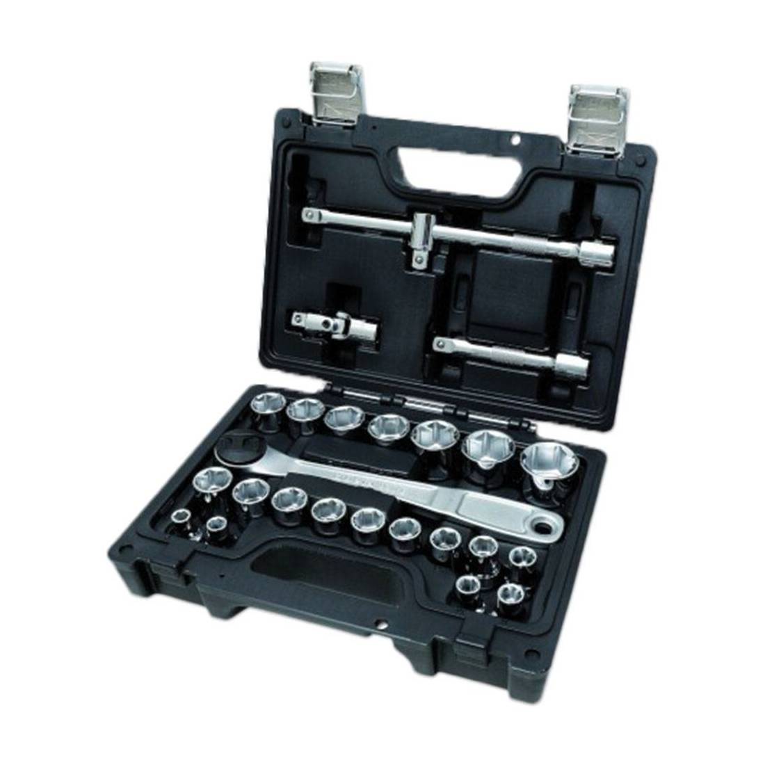 In acciaio, con attacco da 1/2'. Composizione: chiavi a bussola esagonali da 1/2' misure 8-9-10-11-12-13-14-15-16 17-18-19-20-21-22-23 24-27-30-32 mm, snodo con attacchi quadri maschi e femmina 1/2', prolunga con attacchi maschi e femmina da 1/2' 125 mm, prolunga con attacchi maschi e femmina da 1/2' 250 mm, raccordo F3/8'xM1/2', cricchetto reversibile 1/2' da 264 mm. Valigetta plastica antiurto con chiusure in metallo.