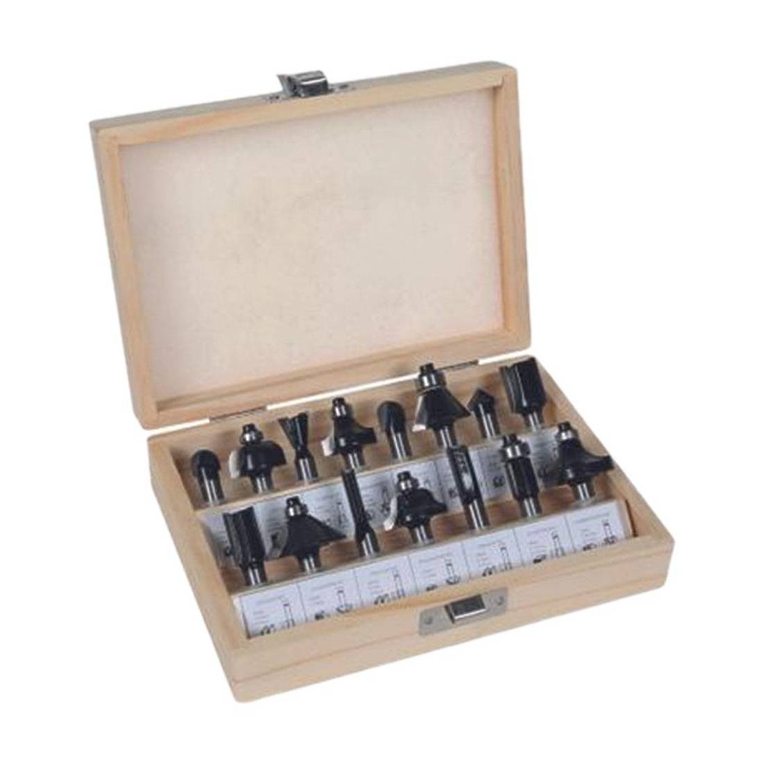 In cassetta legno. Gambo Ø mm 8. Contiene frese a scanalatura, frese a V, frese cave, frese per smusso a 45°, frese rotonde, frese per profili. Misure mm 6 - 10 - 12 - 16 - 12,7 - 28,6 - 22 - 22 W 45°- 30 - 12,7 W 14° - 9,53 - 12,7 R 6,35 mm - 12,7 W 90°- 22 R 6,35 mm - 25. Per utilizzo con fresatrici verticali. In cassetta legno.
