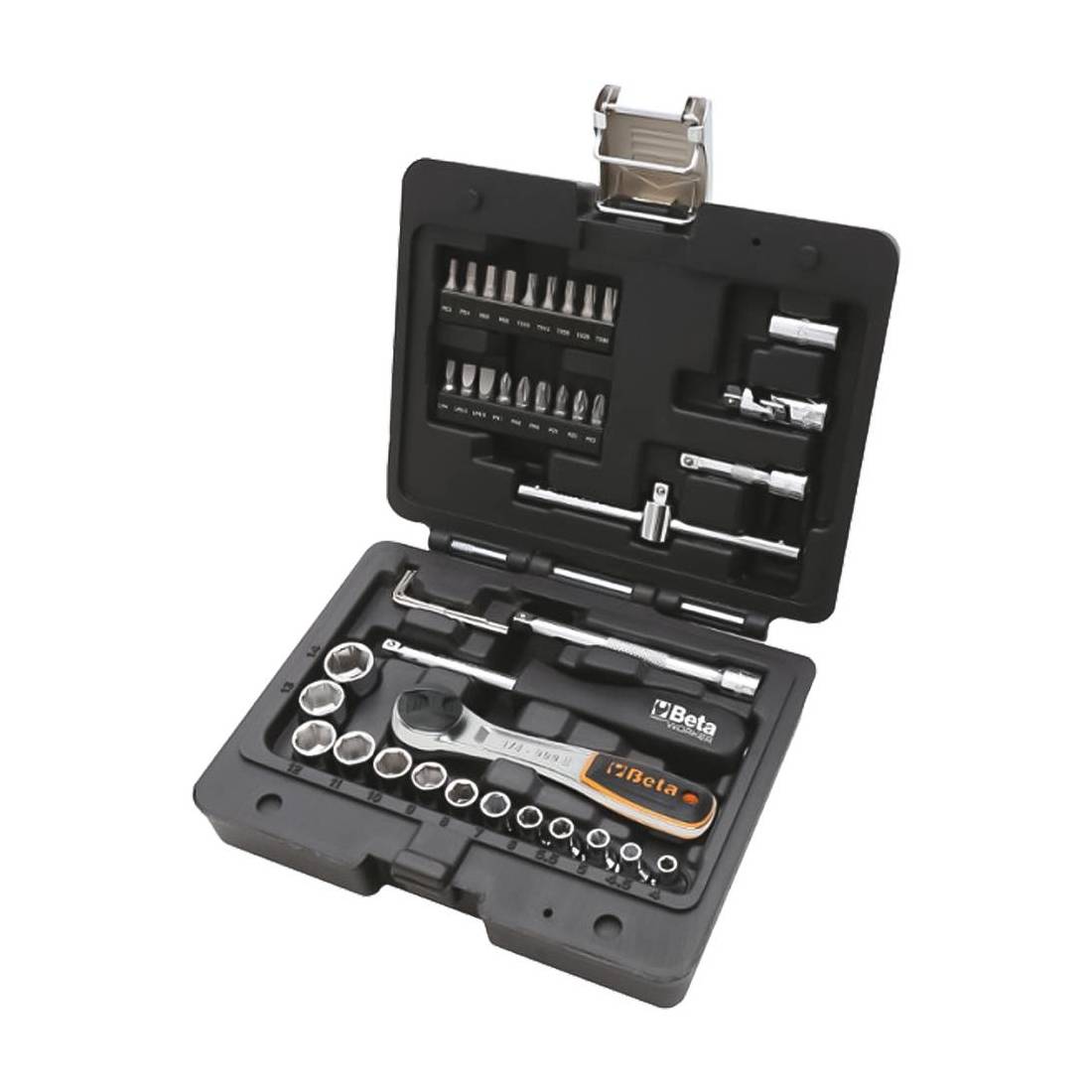 In acciaio attacco da 1/4. Composizione: cricchetto reversibile con attacco quadro maschio da 1/4 con meccanismo a 48 denti 125x25x18, chiavi a bussola attacco da 1/4 misure 4-4,5-5-5,5-6-7-8-9-10-11-12-13-14 mm, snodo da 1/4, prolunga da 1/4 da 50 mm, prolunga da 1/4 da 100 mm, quadro maschio da 1/4 con spina scorrevole da 115 mm, giravite con attacco quadro da 150 mm chiavi a brugola piegate 1,3-1,5-2-2,5 mm, innesto da 1/4 quadro a 1/4 esagonale, inserti 861LP 1/4: 0,6X4-0,8X5,5-1,2X6,5 mm, PH1-PH2-PH3, PZ1-PZ2-PZ3, T10-T15-T20-T25-T30, inserti 861PE 1/4: 3-4-5-6 mm. In valigetta.