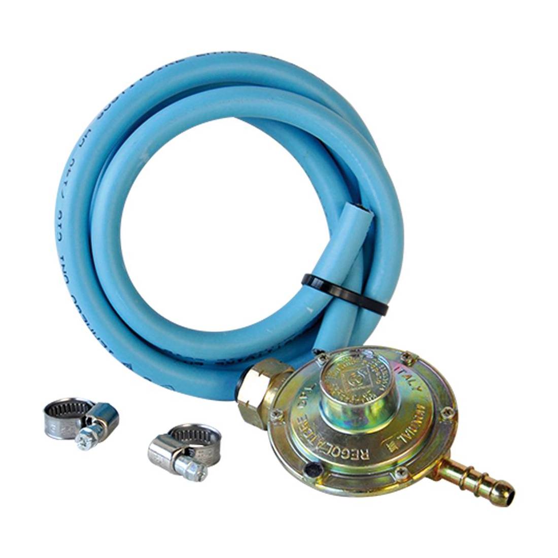 Composizione: 1 regolatore GPL bassa pressione a taratura fissa 28/30 mbar omologato IMQ, 1 tubo da 1,25 mt per gas GPL UNI 7140 omologato IMQ a due strati con pressione esercizio 0,2 bar, 2 fascette stringitubo in acciaio temprato e galvanizzato da Ø 10-17 mm. In blister.