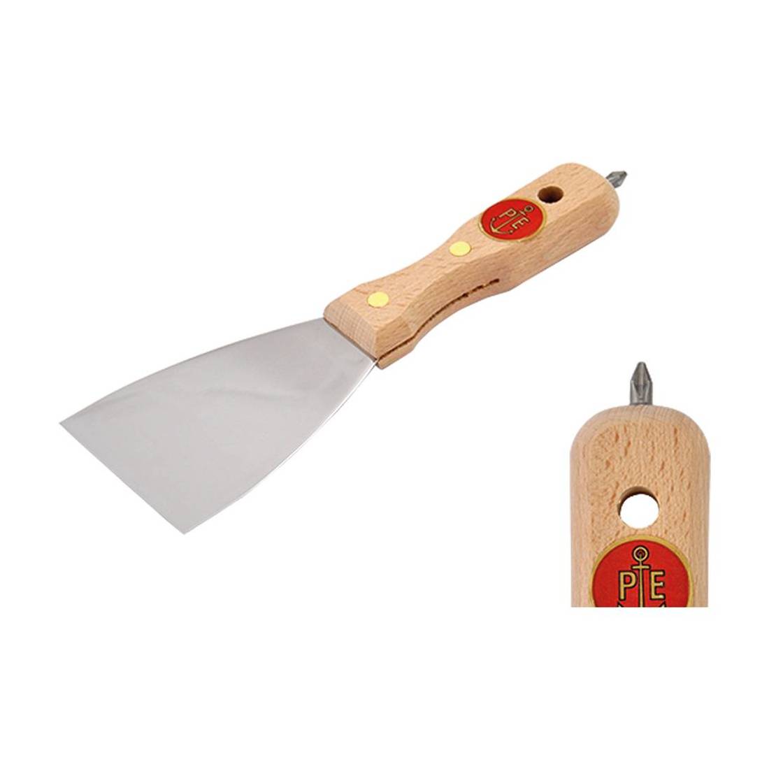 In acciaio inox, manico in legno con inserto cacciavite a croce. Per rasatura e lucidatura di stucco e grassello di calce.