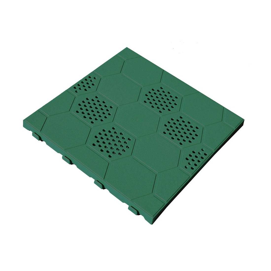 In polipropilene, modulabile, autobloccante. Adatta per giardini, gazebo, piscine, viottoli, vivai. Cellette a nido d'ape sul fondo che conferiscono maggiore portata. Non assorbe odori, non trattiene umidità, resiste ad oli e solventi. Colore verde.