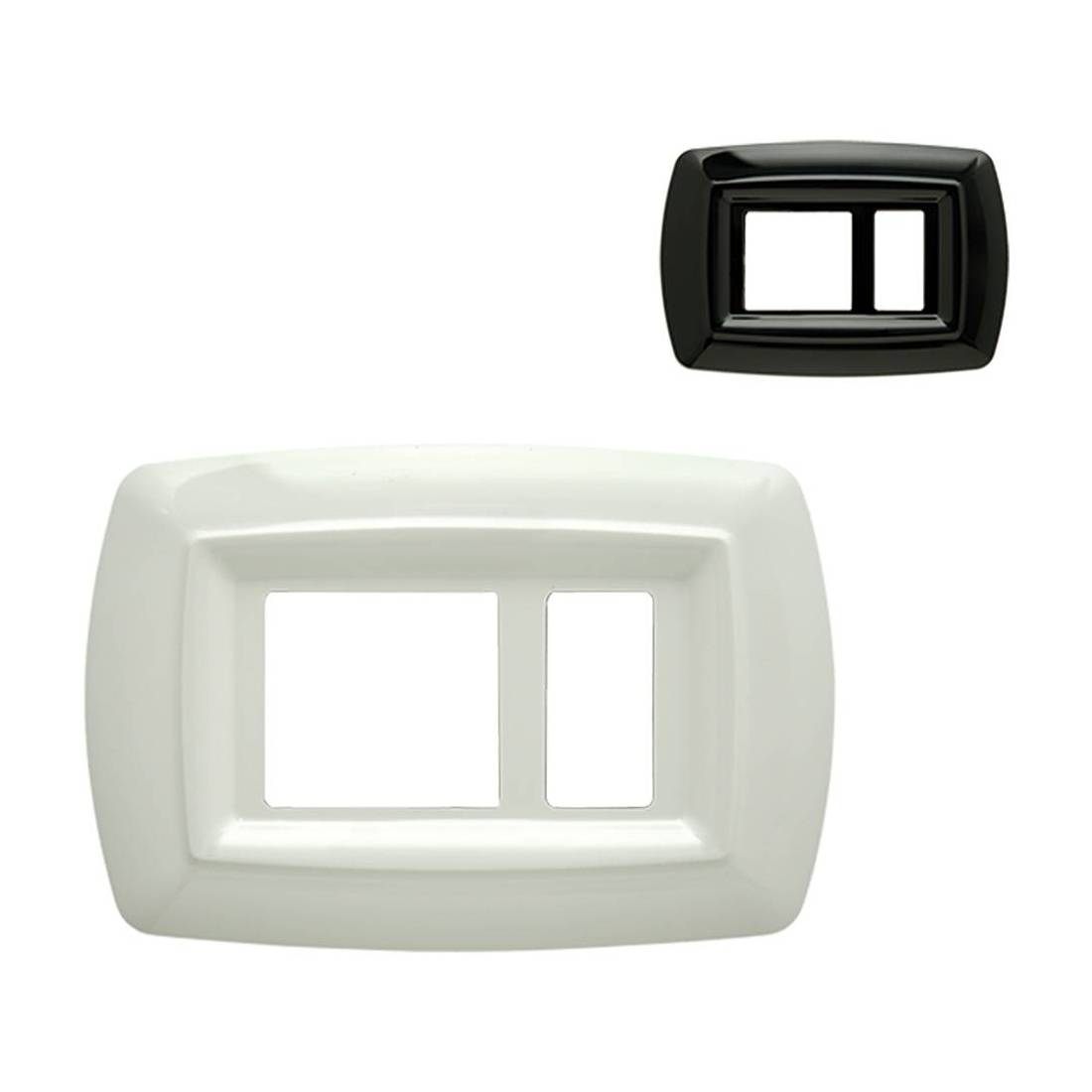 In ABS. Il modello Tondò è una serie di placche di semplice installazione. Facente parte della Serie Laser sono compatibili con gli standard Magic International Bticino.