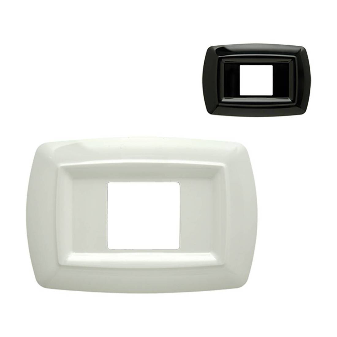 In ABS. Il modello Tondò è una serie di placche di semplice installazione. Facente parte della Serie Laser sono compatibili con gli standard Magic International Bticino.