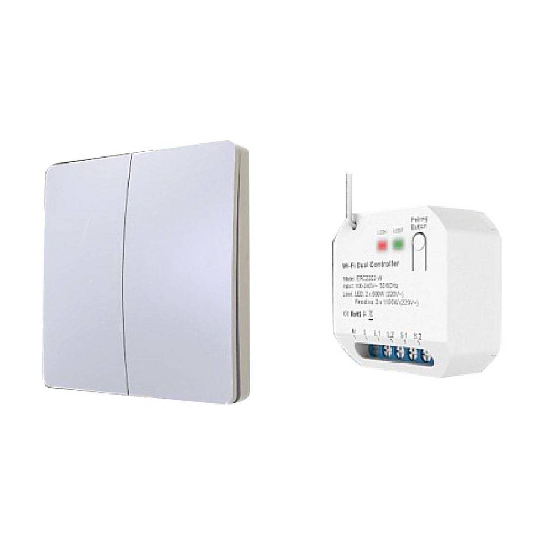 In kit composto da (A): pulsante doppio senza fili e senza batteria, alimentato da un meccanismo piezoelettrico che genera l’energia di cui ha bisogno ogni volta che viene premuto. Può anche essere usato come due comandi indipendenti collegati ad attuatori diversi. Ciascuno dei due pulsanti può comandare un numero a piacere di attuatori. Dimensioni: 86x86x16 mm. Range di funzionamento 25 m interno / 60 m esterno. Grado di protezione IP67. (B): relè doppio 5A Wi-Fi, capace di comandare due carichi indipendenti fino a 1100 W resistivi o 500W LED. Grazie alla connettività Wi-Fi, si possono comandare entrambi i carichi anche da remoto o tramite gli assistenti vocali Amazon o Google. Può essere comandato, inoltre, anche da 1 fino a 10 diversi pulsanti FEB Easy senza bisogno della Wi-Fi. Dimensioni: 44x44x22 mm. Range di funzionamento: collegato a pulsanti FEB Easy 25 m interno / 60 m esterno.