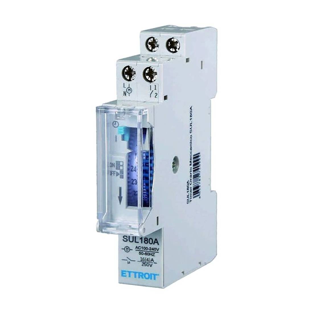 Dispositivo progettato per attivare e disattivare l'illuminazione o altri apparecchi elettrici in modalità 24 ore. Corpo in termpolastico resistente alle alte temperature ed autoestinguente. Motore passo-passo comandato al quarzo. Con interruttore manuale a 3 posizioni: on permanente/auto/off permanente. Interruttore analogico con programma giornaliero, riserva di carica, 96 segmenti di commutazione, tempo di commutazione 15 minuti. Morsetti a vite. montaggio su barra DIN. Carico massimo: 1000 W (lampade incandescenza-alogene), 150 W (lampade risparmio energetico), 30 W (lampade LED < 2 W), 300 W (lampade LED 2-8 W), 300 W (lampade LED > 8 W. Tensione esercizio 230 - 240V AC, frequenza 50-60 Hz. Protezione IP20.